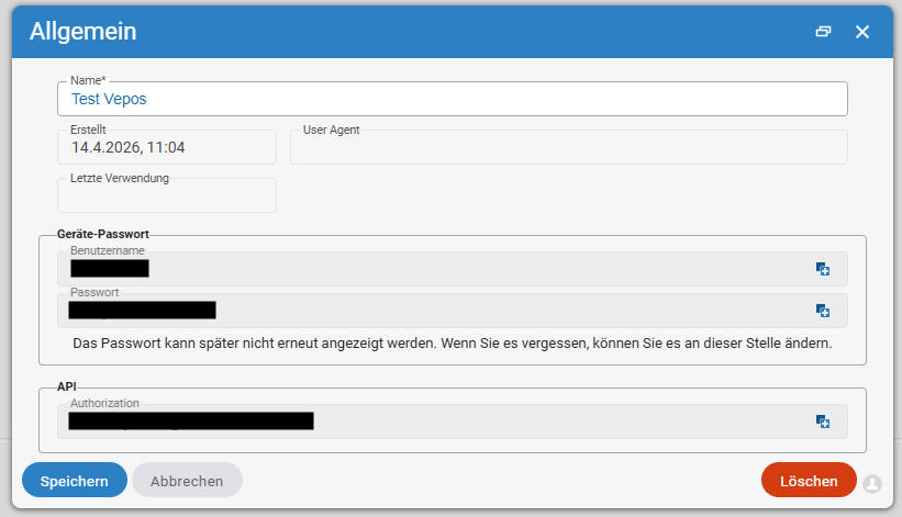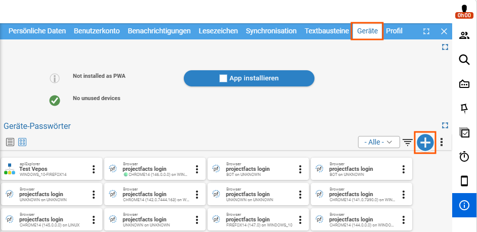 - In projectfacts muss ein Gerät angelegt werden, über das Benutzername und Passwort für die Schnittstelle generiert werden.