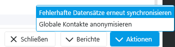 Über den Button Aktionen können ggf. fehlerhafte Datensätze erneut synchronisiert werden. Mit der Funktion Globale Kontakt anonymisieren werden alle Kontakte mit abgelaufener Löschfrist aus projectfacts abgerufen. Diese Kontakte werden anschließend in v.Soft gemäß den Einstellungen anonymisiert.