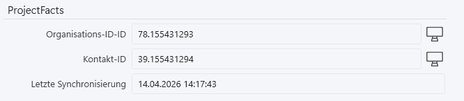 In Kunden und Lieferanten findet sich im Profil der neue Bereich projectfacts. Hier können die ID der Organisation (Kunde/Lieferant) sowie die Kontakt-ID (projectfacts legt die Organisation nochmals als eigenen Kontakt an) eingesehen sowie über einen Button direkt in projectfacts aufgerufen werden.