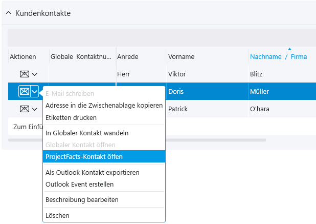 In den Kontakten findet sich dazu ebenfalls eine entsprechende Aufrufmöglichkeit in den Aktionen (projectfacts-Kontakt öffnen).